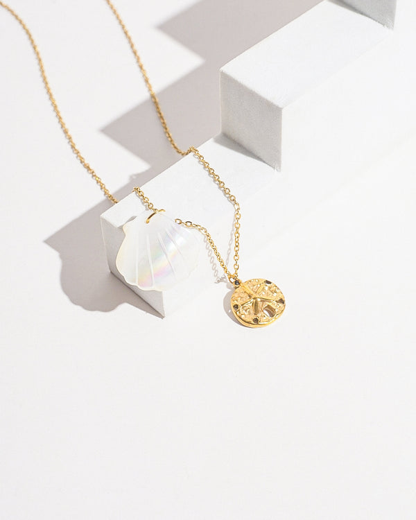 - Dainty necklaces with faux shell & a gold medallion pendant.