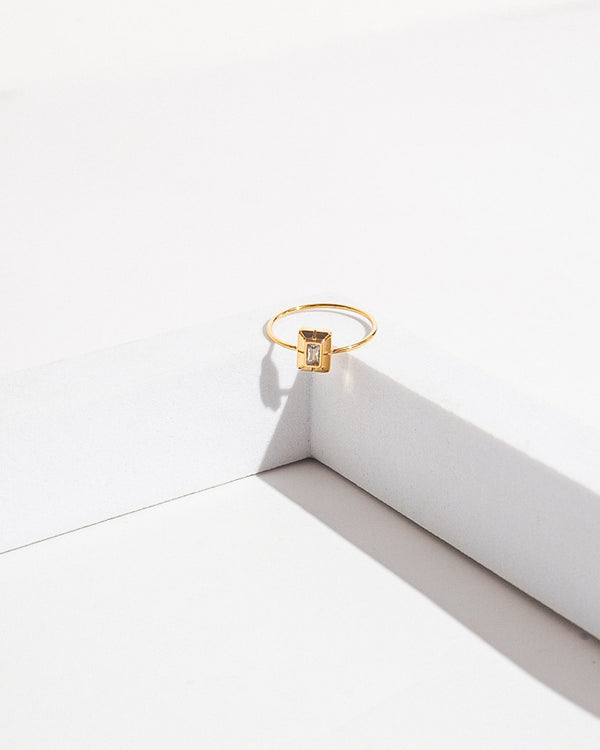 - Sleek gold ring featuring a radiant baguette-cut zircon centerpiece.