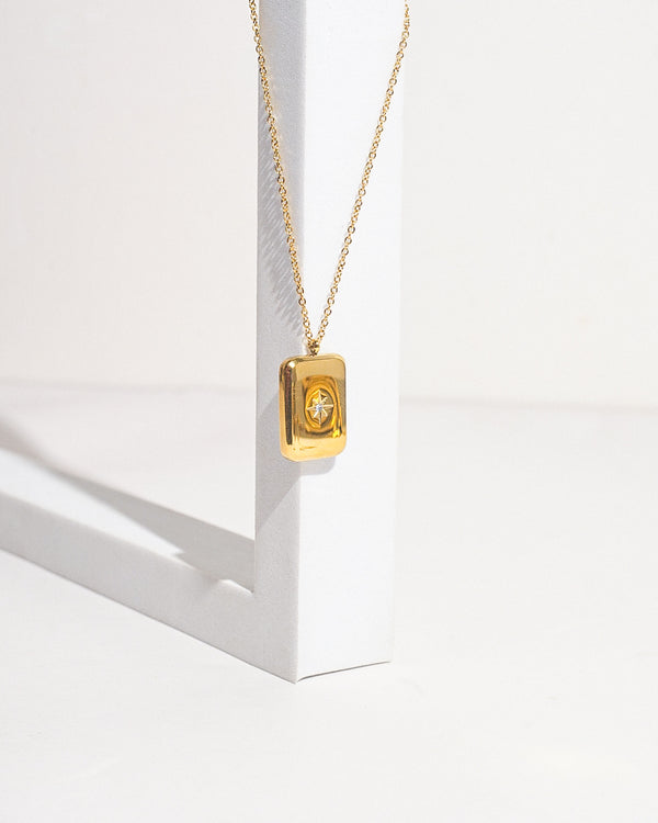 - Simple, dainty necklace with a gold pendant inspired by sunshine.