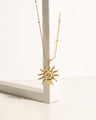 Gold ball chain with a statement pendant inspired by the sun's rays.