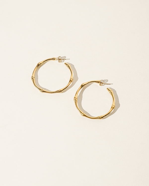 A slimmer version of our Tropica Earrings. Gold hoops with bamboo details.