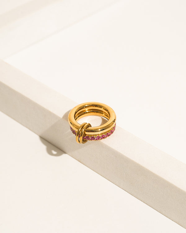 - Dual stacked intertwined gold bands with pink zircon inlays.