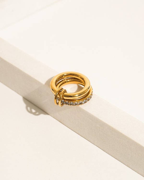 - Dual stacked intertwined gold bands with light blue zircon inlays.