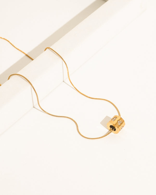Minimalist gold chain with a heart-engraved tube pendant.